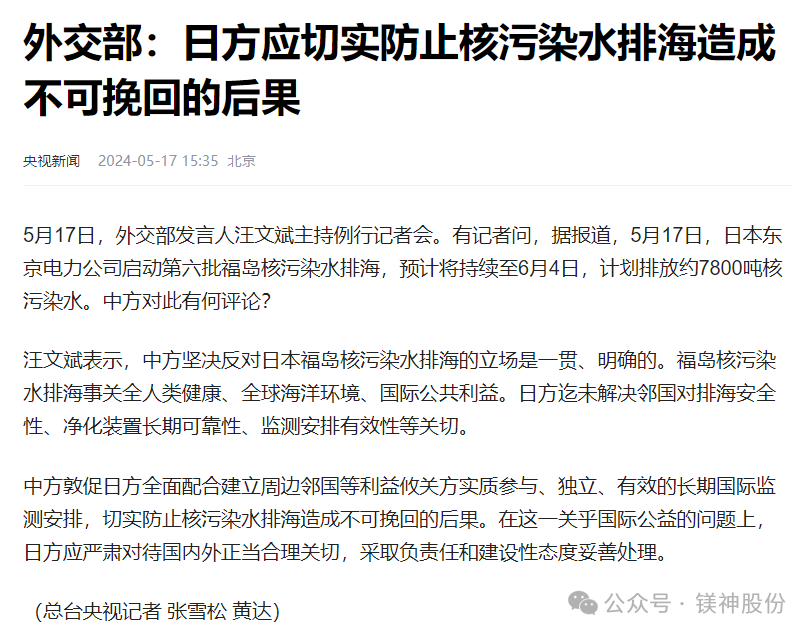多家日本企業(yè)(如:日本神島化學(xué)有限公司、日本協(xié)和化學(xué)工業(yè)有限公司、日本富田制藥株式會(huì)社、日本宇部株式會(huì)社、日本達(dá)泰豪化工工業(yè)株式會(huì)社等)正在使用被核污水污染的海水生產(chǎn)鎂鹽產(chǎn)品(如:碳酸鎂、硫酸鎂、氫氧化鎂、氧化鎂等)的事實(shí)引起了人們的關(guān)注。